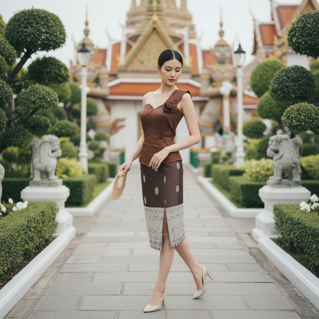 This refined one-shoulder dress set blends modern elegance with traditional textile artistry. The structured brown top features a graceful asymmetric neckline accented with a fabric flower detail, creating a sophisticated and feminine silhouette.